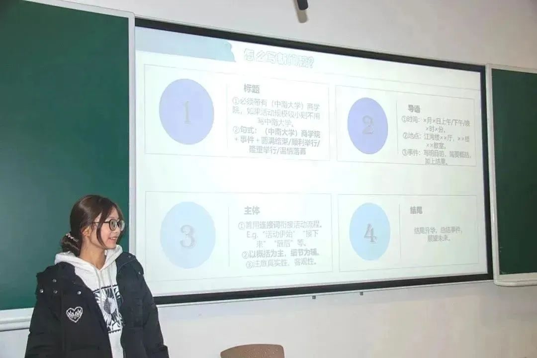 12月13日,“薪火计划”第三堂课于江湾楼116教室举行。由文敏孜主讲。主讲人从新闻稿的重要性、撰写原则、内容要求和格式规范及其注意事项四个方面介绍新闻稿写作的相关事宜。她还与在场同学亲切互动,双方交流了新闻稿写作经验,在场同学纷纷表示受益匪浅。