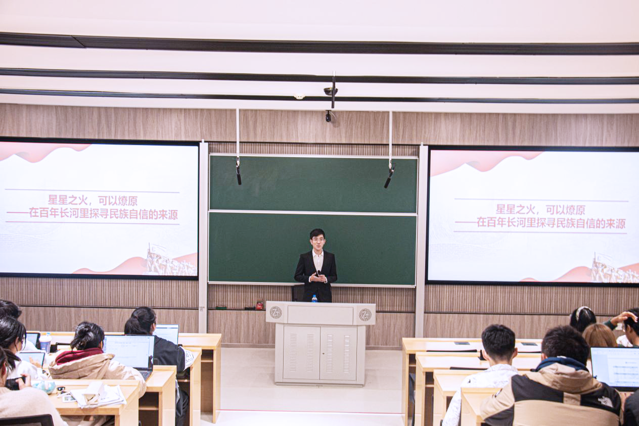 12月10日,“薪火计划”第二堂课于江湾楼大汉厅举行。主讲人王昊轩以“星星之火,可以燎原——在百年长河里探寻民族自信的来源”为主题,结合中国共产党团结领导中国人民的百年奋斗史,强调了国家强盛是中华民族自信的底气与根本。他将民族自信的来源高度概括为民族主体、民族个体、民族先锋、民族精神和民族道路五个方面,并向在座同学发出倡议,希望大家能够传播中国故事,传递中国声音,传承红色基因,强化使命担当。