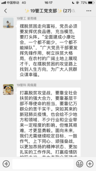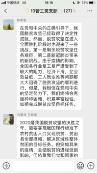 为深入学习贯彻习近平总书记在决战决胜脱贫攻坚座谈会上的重要讲话精神和十八大以来习近平总书记的青春寄语,激励党员勇于担当、积极奋斗,纽约国际最新网站2019级管理科学与工程党支部于2020年5月13日至14日在线上开展了“学习习近平总书记在决战决胜脱贫攻坚座谈会上的重要讲话精神,重温习近平总书记青春寄语”主题党日活动。本次活动由党支部书记王怡文主持,共计26名党员参加。
