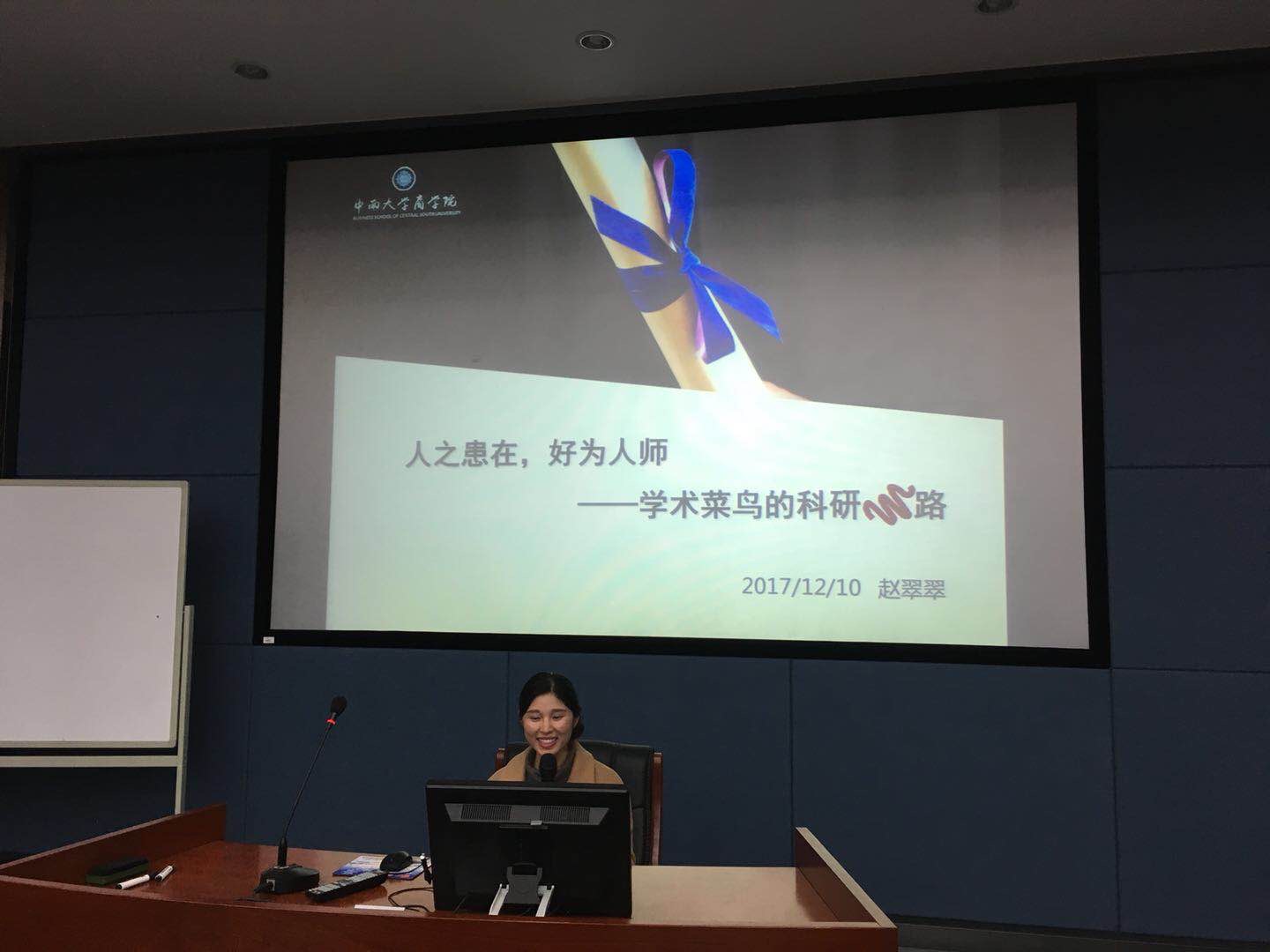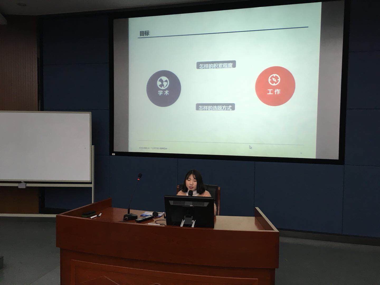 讲座的主题是“论·研学”,讲座内容分为优秀学术成果讨论及优秀学术经验分享两个方面。首先,赵翠翠同学为大家分享了自己做学术研究的一点体会。她建议同学们应该做好研究生规划,看自身读研是基于科研,还是就业。科研要针对感兴趣的方向,而就业则应掌握主动权,尽量早点开始动笔。她还分享了自己的一些学业规划经验:第一学期掌握论文套路,第二学期开始撰写论文,第三学期着手修改投稿,第四学期准备实习就业。