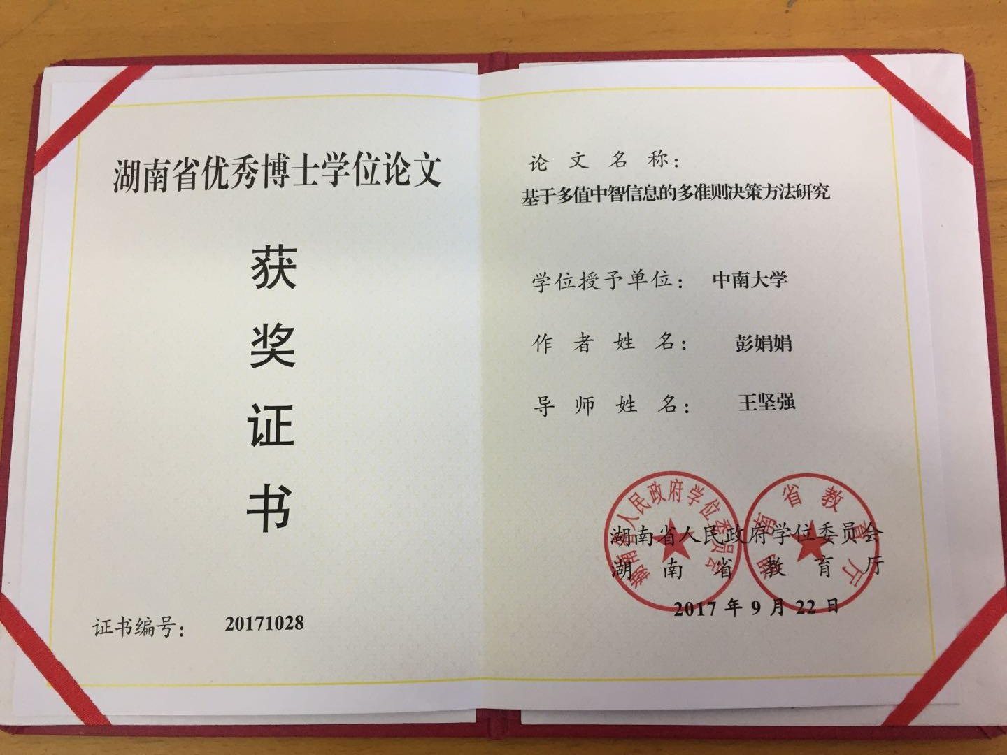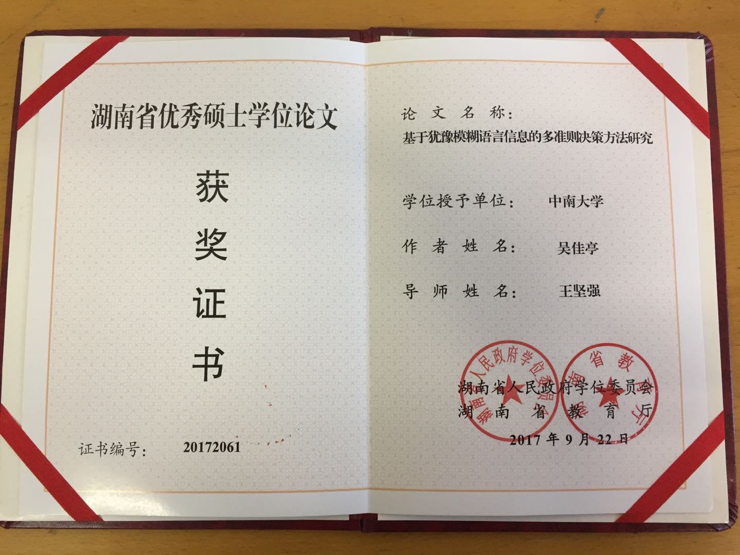 2017年12月学校下发了《2017年湖南省优秀博士、硕士学位论文》证书,此次全校荣获2017年湖南省优秀硕士学位论文46篇、优秀博士学位论文18篇,纽约国际官网三名研究生的学位论文名列其中,可喜可贺。这三名研究生分别是王坚强教授指导的彭娟娟博士、吴佳亭硕士以及刘爱东教授指导的曾辉祥硕士。