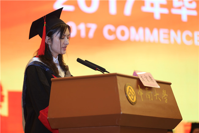 随后,来自信息管理与信息系统1302班的梁程浩同学发言。梁程浩首先代表全体本科毕业生向母校、学院和老师们由衷地表达感谢与祝愿。她回忆在中南的点点滴滴,细数学院为他们所做的一切,深情致言老师、父母和同窗们。并立誓,自己及在座的所有学子定将永远坚守中南的气度与梦想,继续书写属于中南人的华章。接着,博士生代表、工商管理博士徐戈同学围绕“博士的幸运、情怀与担当”娓娓诉来,感念师恩,歌颂友谊,回味过去,憧憬未来,有力诠释了博士应有的担当,亦为母校、老师、家人和自己献上了美好的祝福。