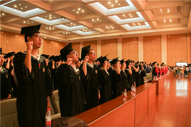 令人意犹未尽的发言环节结束后,便进入庄严的宣誓环节。全体师生起立,毕业生们举起右手,目光坚定,在蒋宇、周昊琦两位同学的领誓下掷地有声地道出誓词。声声入耳,更是入心。