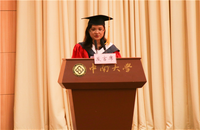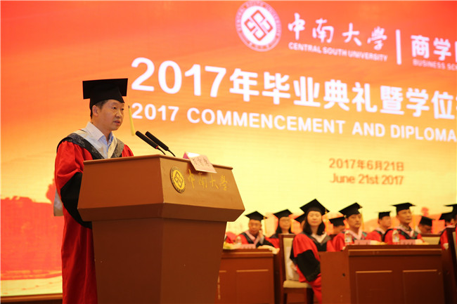 校友代表邹刚博士发表讲话,追溯起在中南的求学时光,分享了自己对毕业季的感受。结合毕业后自身的种种经历,他告诉各位毕业生,除知识、学位、社会认可之外,大学还会让每个人收获毕生的友谊,身边的同学和老师都是我们最珍贵的“无形资产”。最后,邹刚先生愿2017届毕业生们都能不负母校的培养,成为这一时代名副其实的“The Best and the Brightest(出类拔萃之辈)”。字字皆用心,句句含真意。使得在场所有人获益匪浅,不无共鸣。