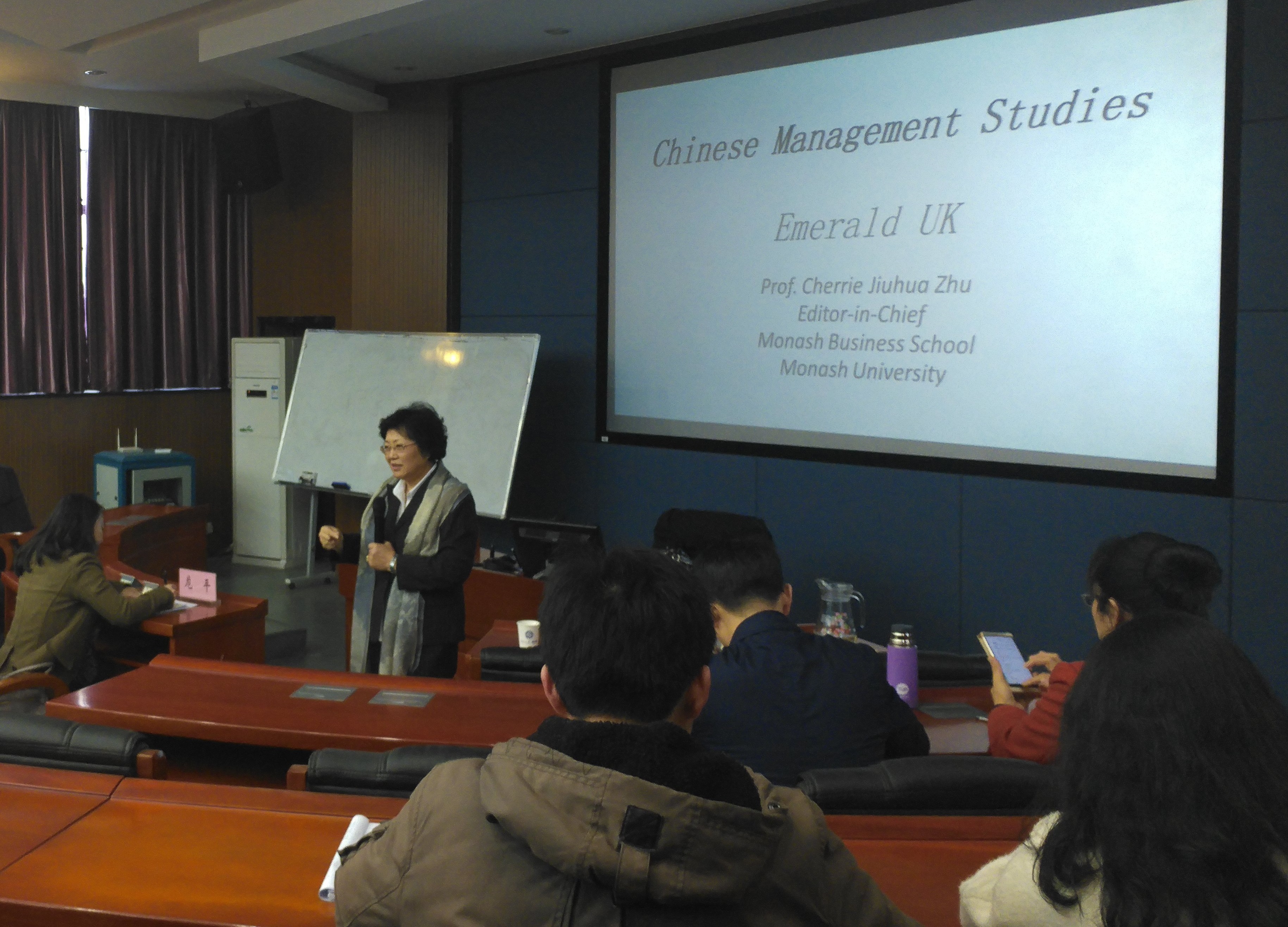 朱久华教授任莫纳什纽约国际最新网站中国项目主任,同时也是 SSCI期刊Journal of Chinese Management Studies(CMS)新任主编。朱教授以自己从学生到教授的学术发展生涯开场,强调了发表高水平论文对于学术发展的重要性同时也鼓励在座的同学敢于向高水平的期刊投稿。作为CMS主编,朱教授对该期刊论文的选题进行了界定,并进一步介绍一篇高水平论文如何进行选题,她强调要在大量阅读的基础上做文献研究。接下来,朱教授对于论文被录用应该遵循的基本原则进行了详细讲解。