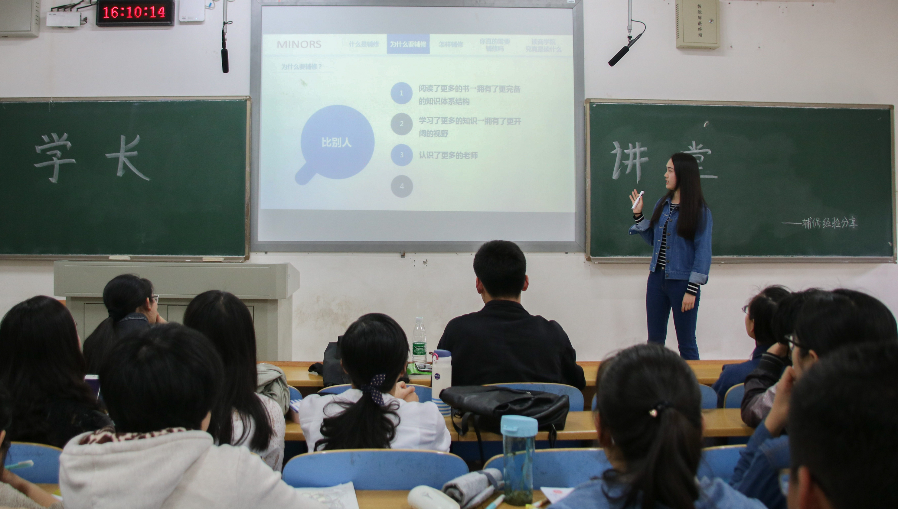 吴宇歌同学和徐丽玮同学首先从什么是辅修、为什么要辅修、怎样辅修、是否需要辅修等几个方面对辅修课程的知识进行了讲解。吴宇歌同学在讲解开头就先提到了辅修学位、辅修专业管理的五大办法——同质教育、鼓励辅修、促进交叉、出口规范及主次明晰,让现场对辅修专业相关知信息不甚明了的同学对辅修有了初步的了解。此外,两位主讲人都谈及了辅修课程的利与弊,告诉同学们“要从双面看待辅修课程”,从而综合个人情况作出选择。最后,两人重点对怎样进行辅修进行了介绍,包括如何应对辅修考试以及通过考试后应该怎样做。其中,吴宇歌同学特别提醒同学们:对于辅修学科,在主次分明的同时要充分重视,不仅要坚持,还要学会体验式学习,同时充分考虑自己的兴趣所在。
